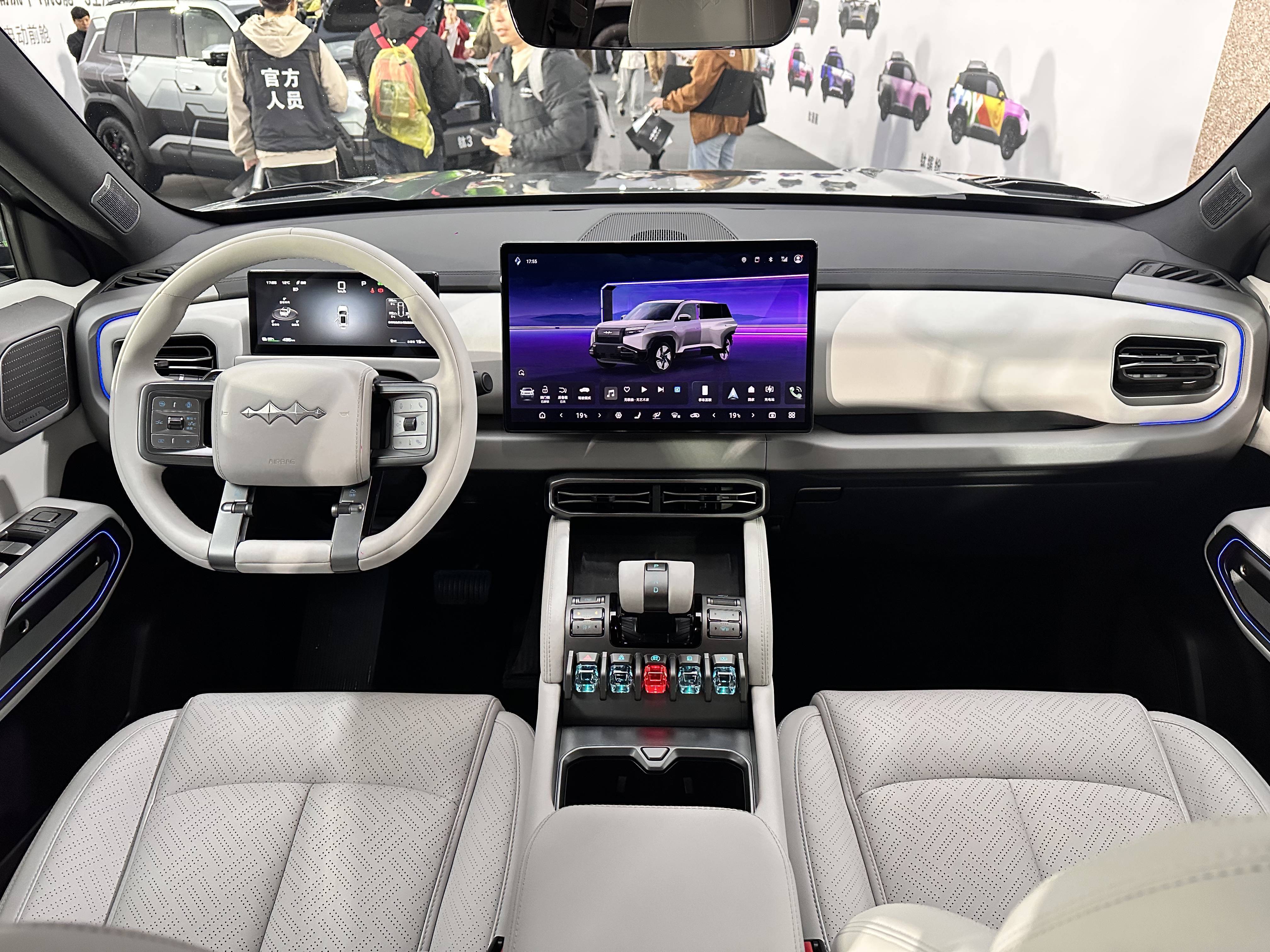 内饰也很有看点,中控台外侧有灰色 C 型饰条环绕,内部还藏着多色氛围灯,晚上开车氛围感奏凯拉满。悬浮式全液晶姿首加上 15.6 英寸中控屏(后驱智驾 Pro 版是 12.8 英寸),再配上 12 英寸 HUD 昂首显现,各式车辆信息、导航啥的,一目了然。标的盘是方程豹经典的四辐式臆测打算,除了多功能按键,底下还有驾驶方法、地形方法滚轮,操作起来超顺遂。副姿首台不时了豹系列作风,换挡杆天然不成升降,但高配车型双方有车载手电筒和车载麦克风,中央扶手箱里还有车载冷暖雪柜,最顽皮制冷到零下 6 摄氏度,最高能制热到 50 摄氏度,无论是夏天喝冷饮,仍是冬天喝热饮,齐能更生。座椅是 2+3 式 5 座布局,用皮质材料包裹,身体斗争的场合还打孔了。除了初学版,前排座椅能电动转机,还有透风、加热功能。后排有空调出风口、USB 接口,和顺到了每一位乘客的欢乐体验。