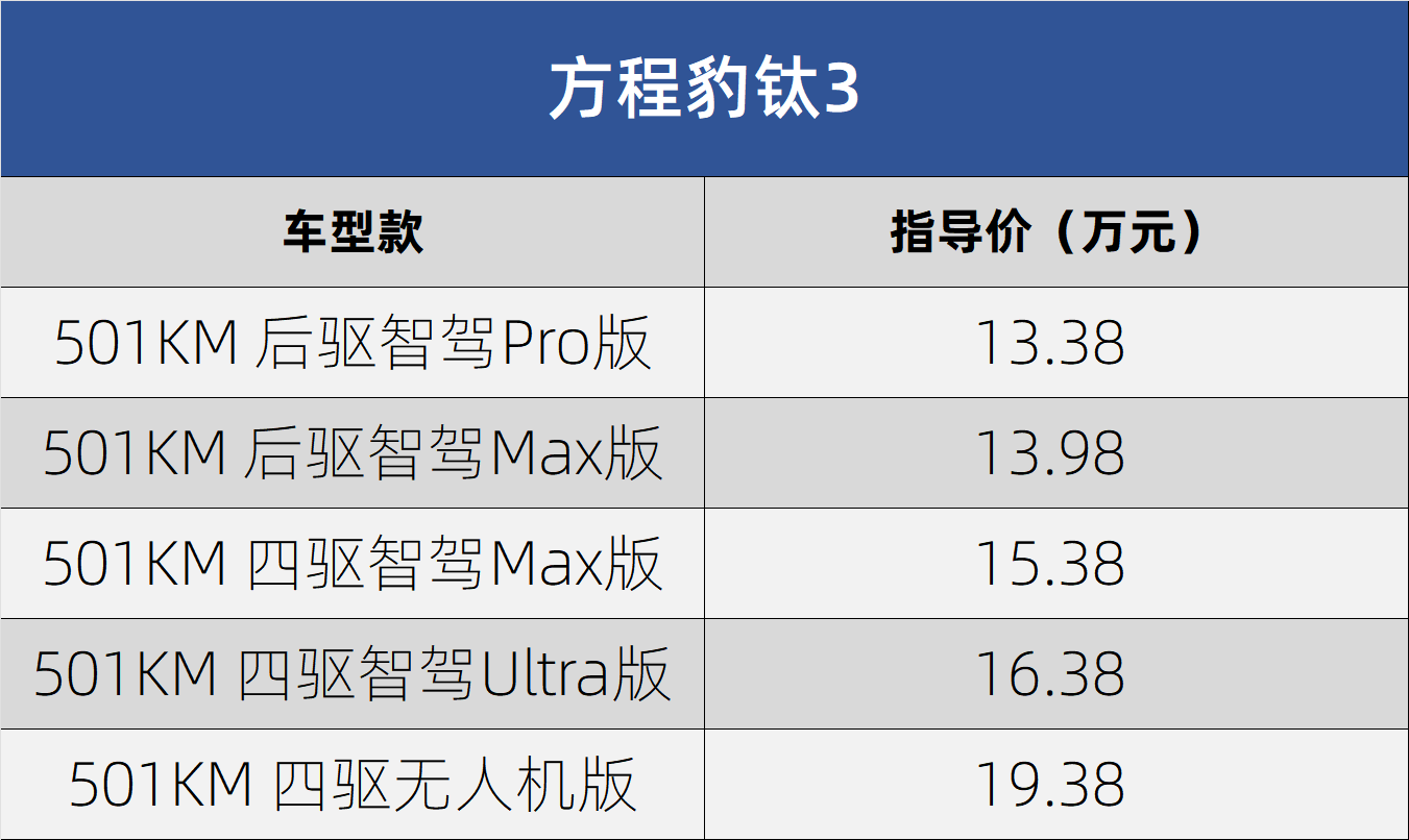 能源:性能强劲,续航塌实钛 3 基于方程豹专属智能 EVO 平台打造,用的是承载式车身。它有后驱和四驱两种能源不错选,四驱版前后双电机空洞输出功率能达到 310 千瓦,最高车速 201 公里 / 小时,0 - 100 公里 / 小时加快唯有 4.9 秒,这能源,一脚油门下去,推背感立马就来。况兼它还秉承了 CTB 电板车身一体化时代,既强化了车身刚性,又普及了碰撞安全性。续航方面也不暗昧,全系车型 CLTC 工况续航里程齐是 501 公里。后驱版电板容量 65.28 千瓦时,四驱版 72.96 千瓦时,无东说念主机版 78.72 千瓦时。四驱版还配备 iTAC 智能扭矩摒弃系统、iATS 智能全地形识别系统、TSS 爆胎赞助稳停系统等,遭受打滑、越野、爆胎等情况,齐能草率沉着。高配车型还有主动预瞄 + 云辇 - C 智能阻尼车身摒弃系统,能提前识别路面情况,转机悬架阻尼,让驾乘更欢乐,操控更泄露。价钱与福利:忠心满满