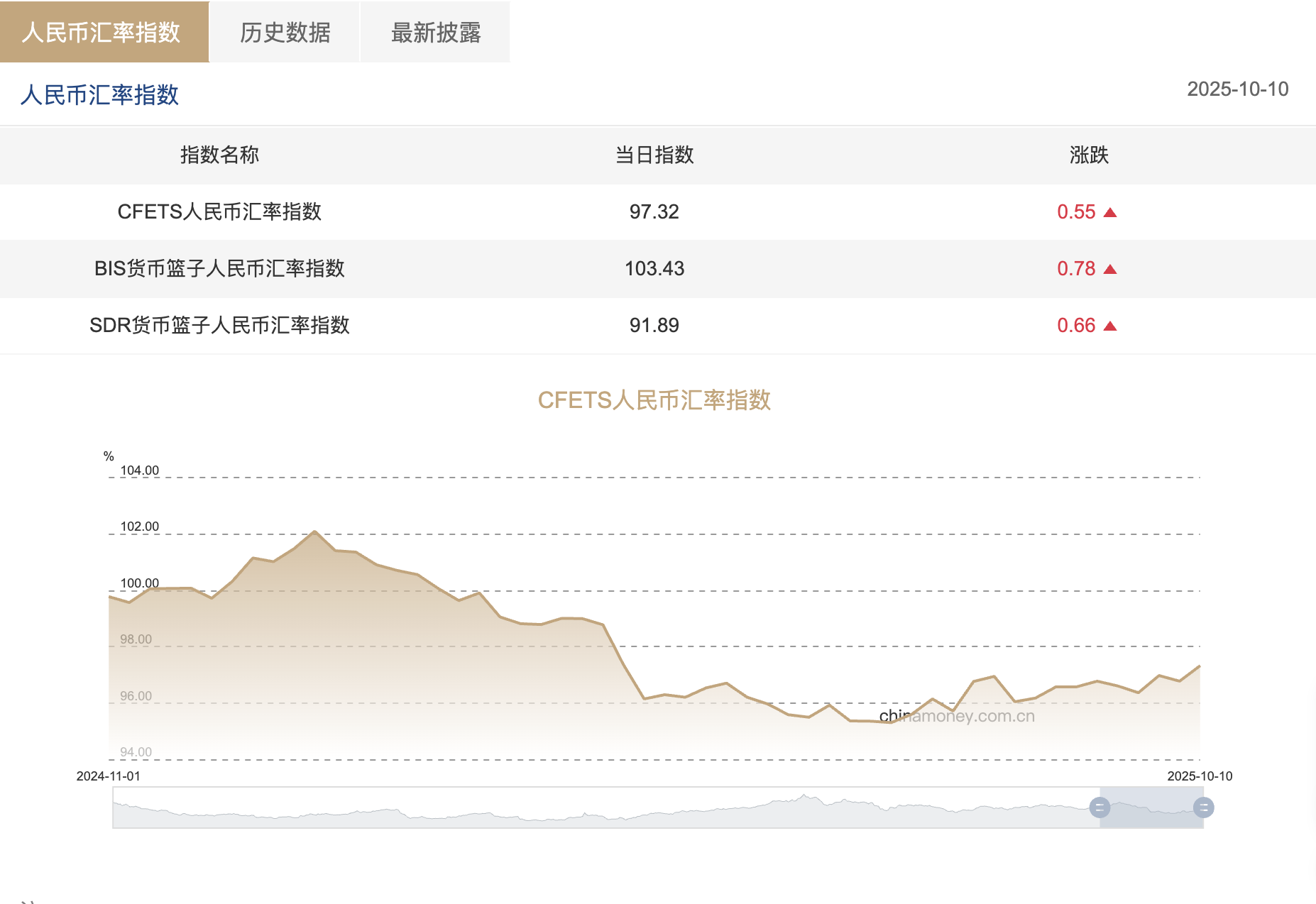 新华财经上海10月13日电(葛佳明) 中国际汇交游中心公布数据清晰,10月10日当周三大东说念主民币汇率指数全线高潮,CFETS东说念主民币汇率指数报97.32,按周涨0.55,创2025年4月以来新高;BIS货币篮子东说念主民币汇率指数报103.43,按周涨0.78,创2025年4月以来新高;SDR货币篮子东说念主民币汇率指数报91.89,按周涨0.66,创2025年4月以来新高。
