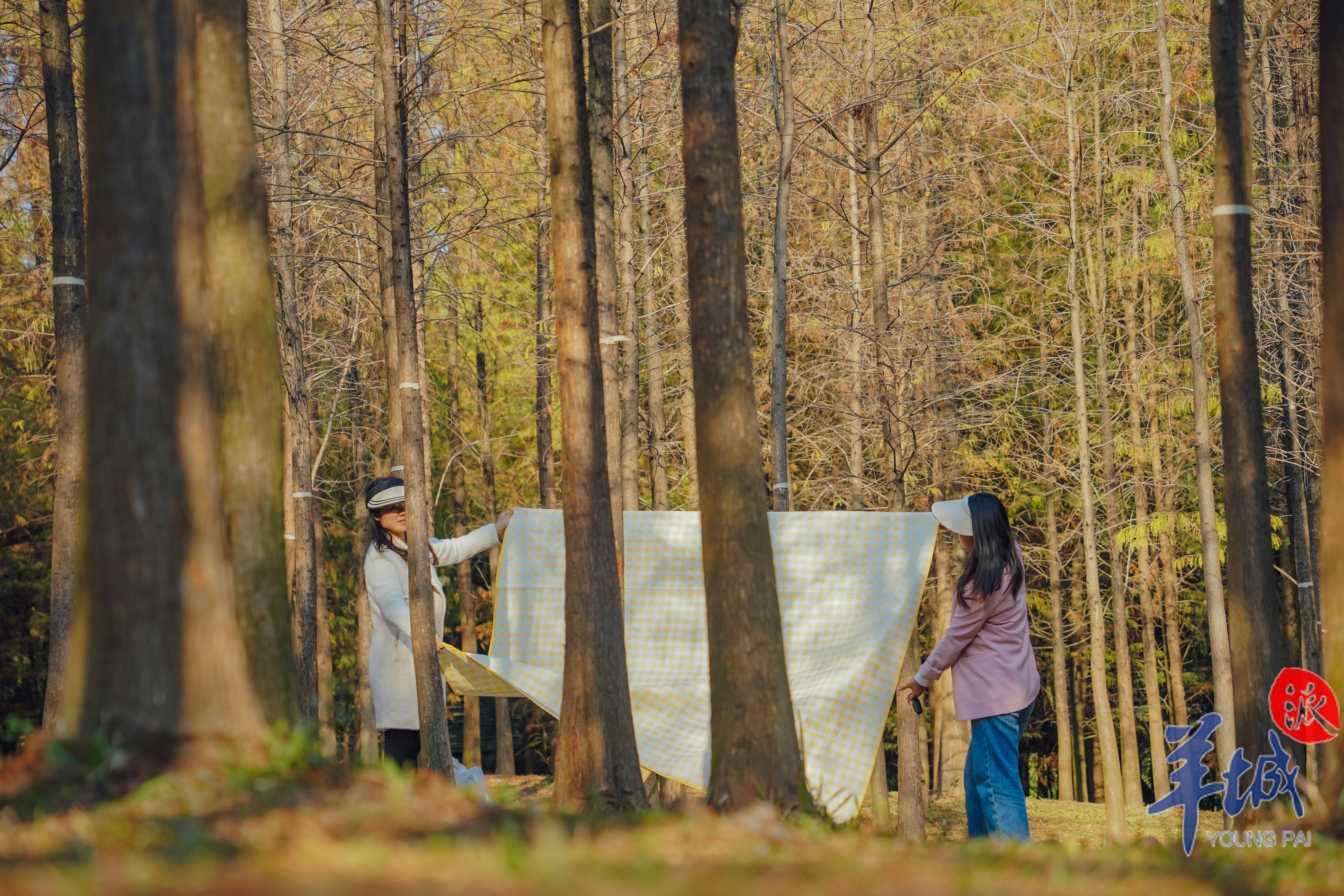 广州河汉湿地公园公园里,搭客们在落羽杉林中摆野餐布。羊城晚报记者 贺全胜 摄