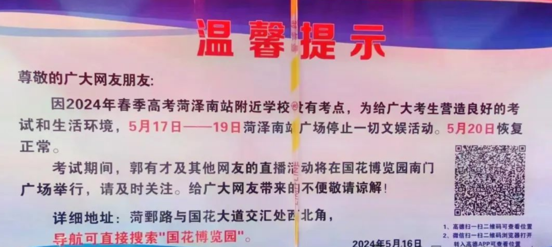 据菏泽日报报说念,因2024年春季高考菏泽南站隔壁学校设有考点,为给繁多考生营造淡雅无比的侦查和生存环境,5月17日至19日菏泽南站广场住手一切娱乐看成。