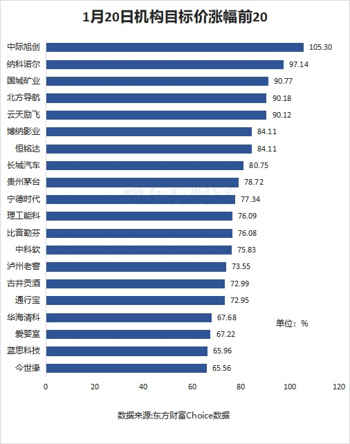以近一月券商研报为样本,按机构贪图价(有多家券商给出贪图价的,取最大值)和最新收盘价比较,摈弃1月20日收盘,中际旭创高涨空间最大,为105.3%。