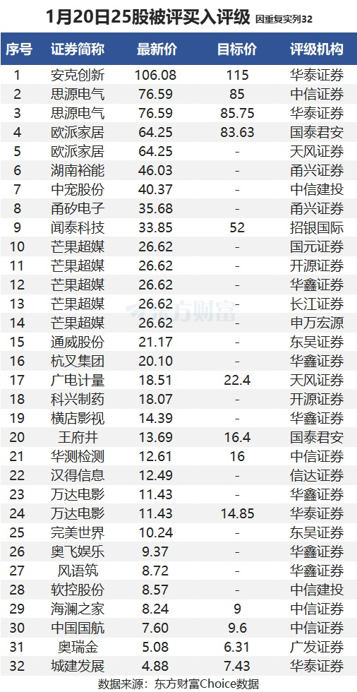 东方钞票Choice数据披露,摈弃1月20日19点,今日有25股被券商评为买入评级,包括安克转变、念念源电气、欧派家居、芒果超媒、万达电影、中国国航等股票。