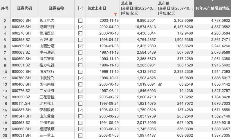 个股市值方面,以2025年10月16日收盘来看,长江电力总市值从18年前的不到2103亿元增长至如今的6890.25亿元;招商银行、恒瑞医药总市值在18年间的升值也均超4000亿元。