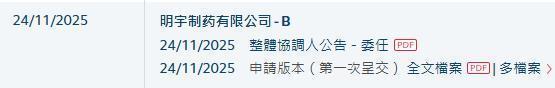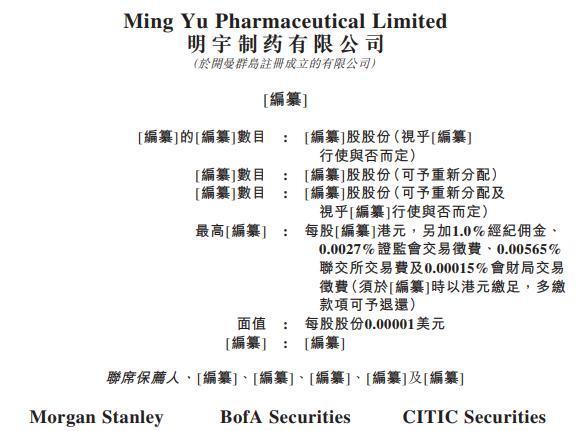 港交所官网信息走漏,11月24日,明宇制药有限公司(下称“明宇制药”)递交招股书,联席保荐东说念主为摩根士丹利、好意思银证券及中信证券。